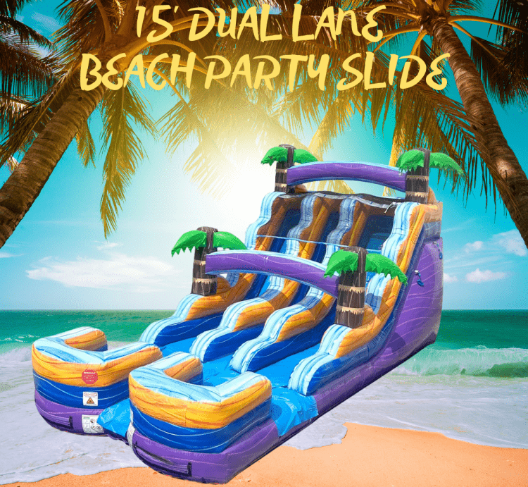 Bring the ultimate summer vibes to your event with our 15-foot Dual Lane Beach Party Slide! With two middle split lanes, kids and guests can race each other to the splash landing, adding extra excitement and friendly competition.